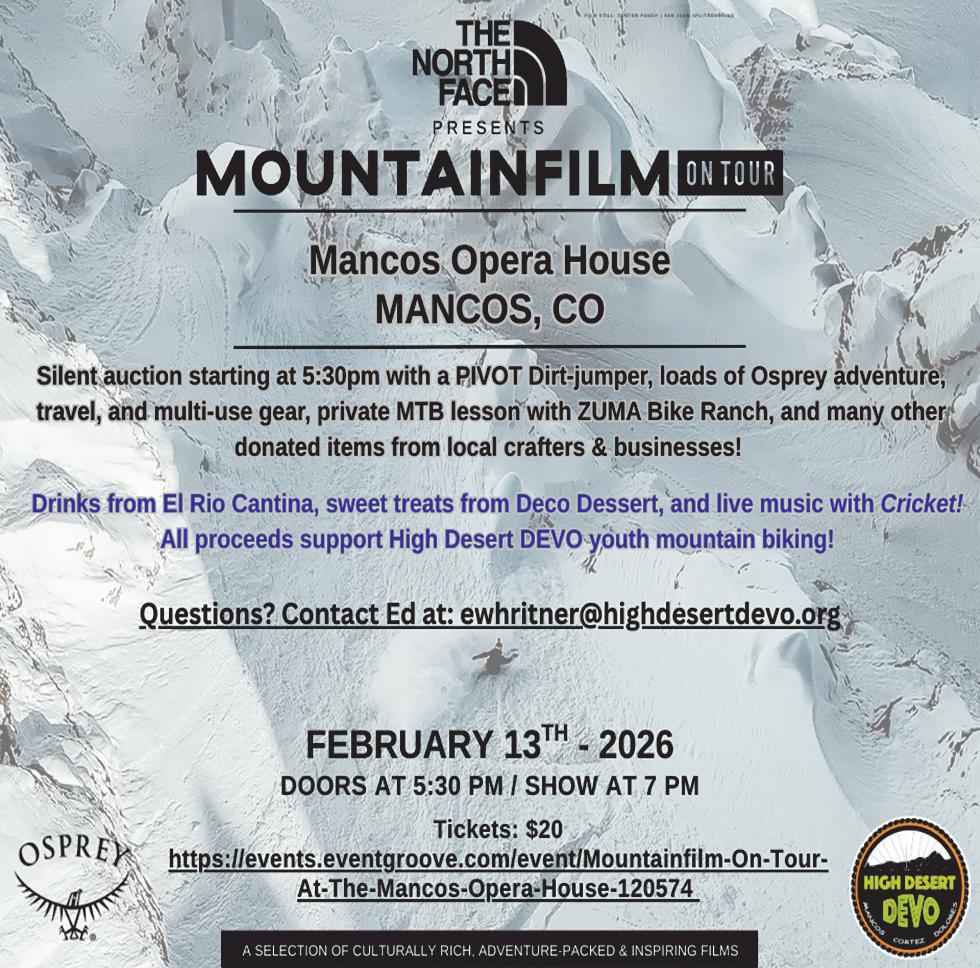 Mountainfilm on Tour, High Desert DEVO fundraiser, Fri., Feb. 13, doors 5:30 p.m., show at 7 p.m., Mancos Opera House, 136 Grand Ave.