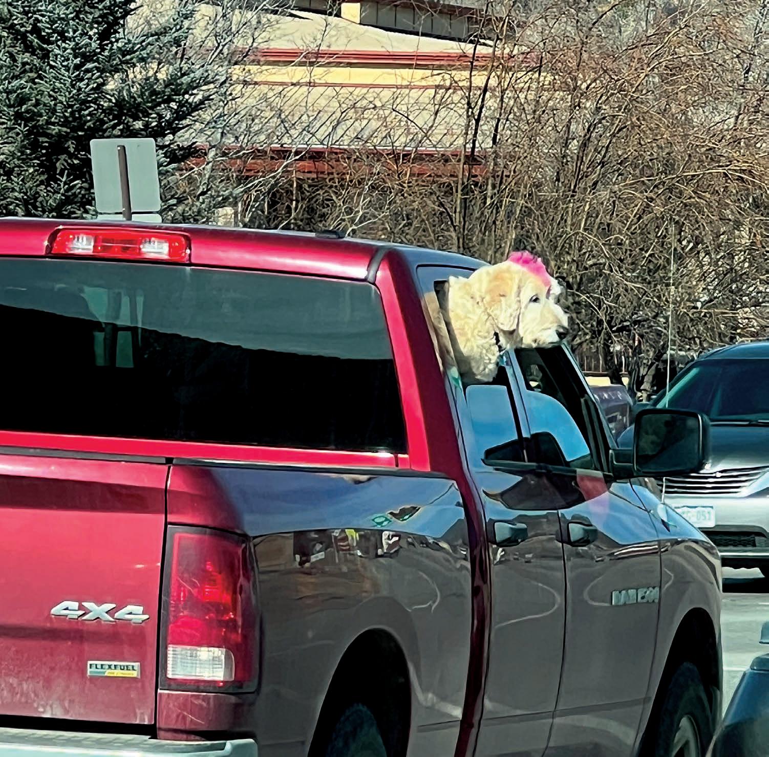 A doodle lets the breeze blow through its hot-pink mohawk during a recent ride in downtown Durango. We have no doubt it was on its way to a Snowdown event./ Photo by Missy Votel