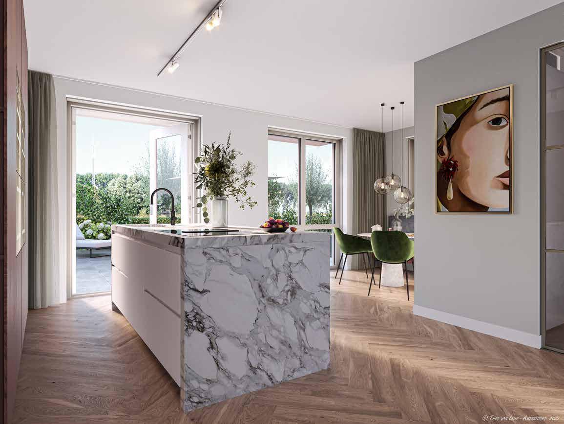 Bij de koop van een twee-onder-een-kap of vrijstaande woning hoort een prachtige eilandkeuken met apparatuur van Siemens en Bora. Het mooie sanitair is van Villeroy & Boch en natuurlijk is de toilet vrij hangend en voorzien van softclose-zitting. In de badkamer maken we een inloopdouche met hardglazen douchescherm en een elektrische designradiator. Alle woningen type C hebben in basis ook een bad. Deze woningen worden voorzien van houten binnenkozijnen met vlakke (stompe) deuren én elke verdieping is voorzien van vloerverwarming die in de zomer passief koelt. Op de zolderverdieping tref je de vierde slaapkamer.