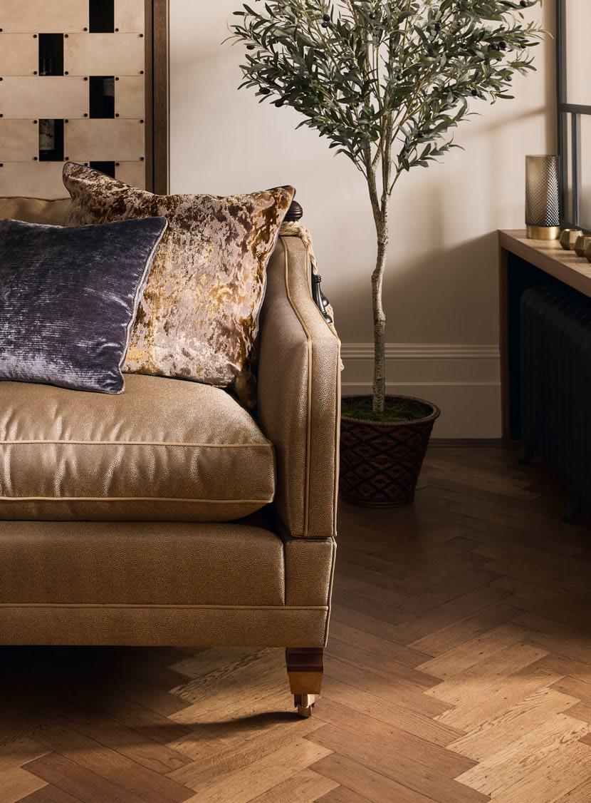 Trafalgar Three Seater in Byzantium Gold, contrast piped in Grosgrain Gold Leaf with two large stylists’ own scatters, two small scatters in Monarch Ash contrast piped in Byzantium Gold. Umber legs with Antique ‘Duresta’ Brass castors.