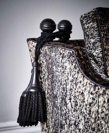 Horatio Chair in Domenico Black/Gold, contrast piped in Grosgrain Black, with small scatter in Amalfi Black, contrast piped in Grosgrain Gold Leaf. Wooden legs in Ebony with ‘Duresta’ Nickel castors.