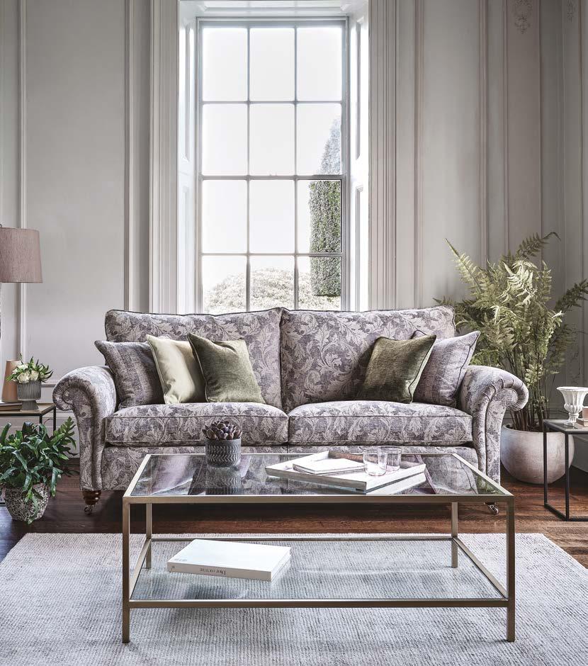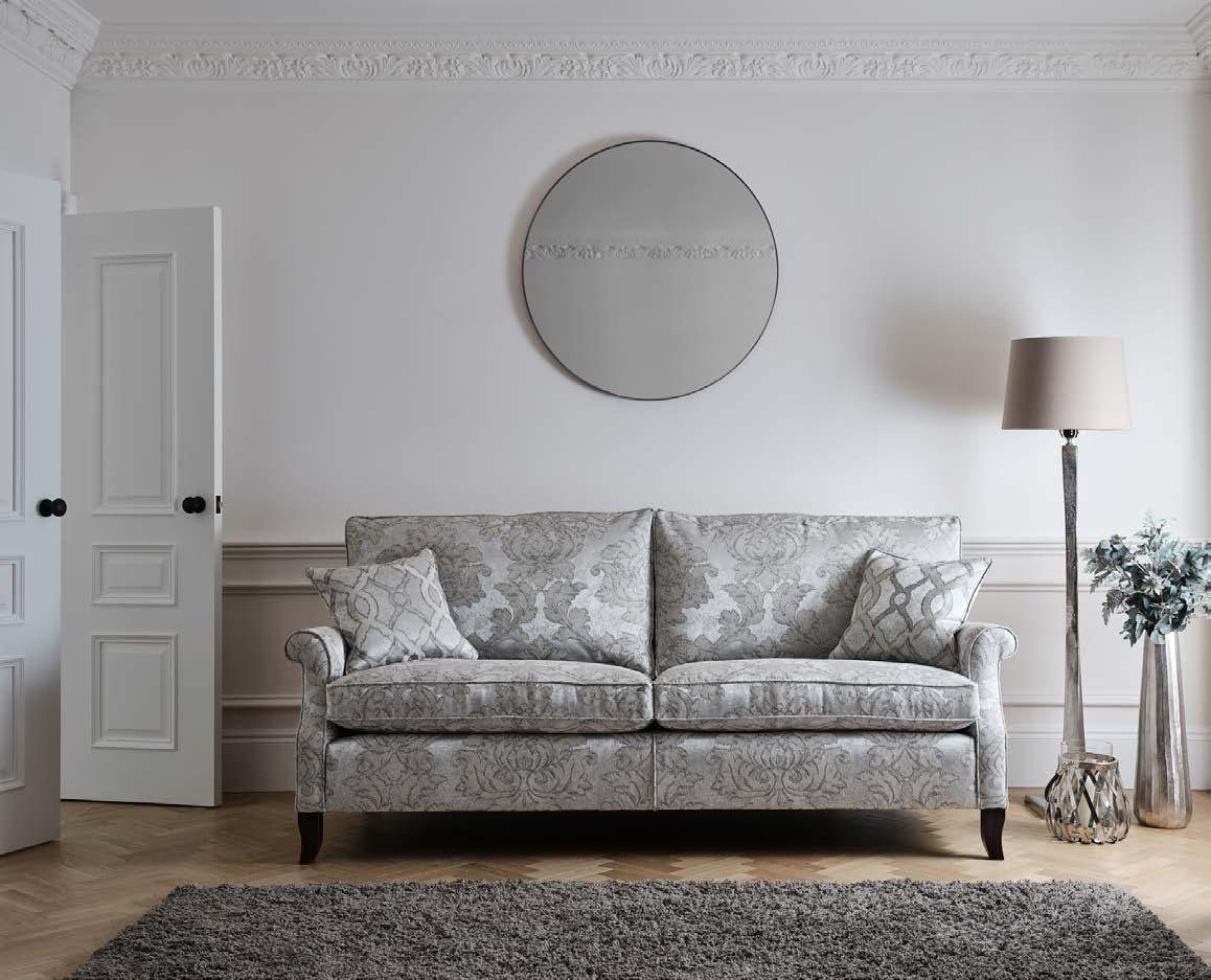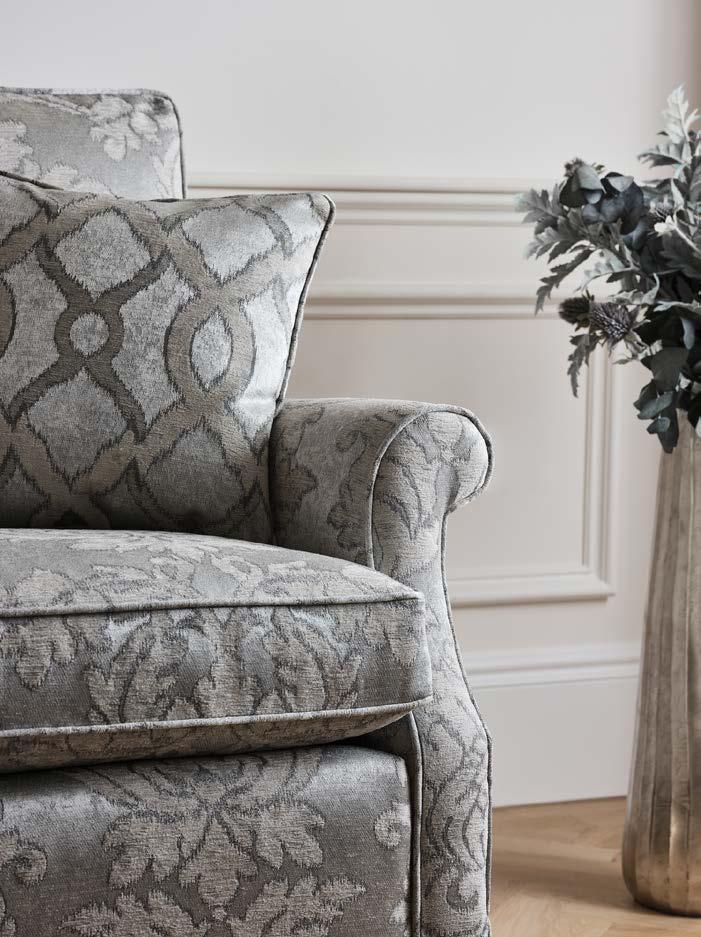 Alex Large Sofa in Camilla Damask Silver with two small scatters in Camilla Trellis Silver. Ebony legs.