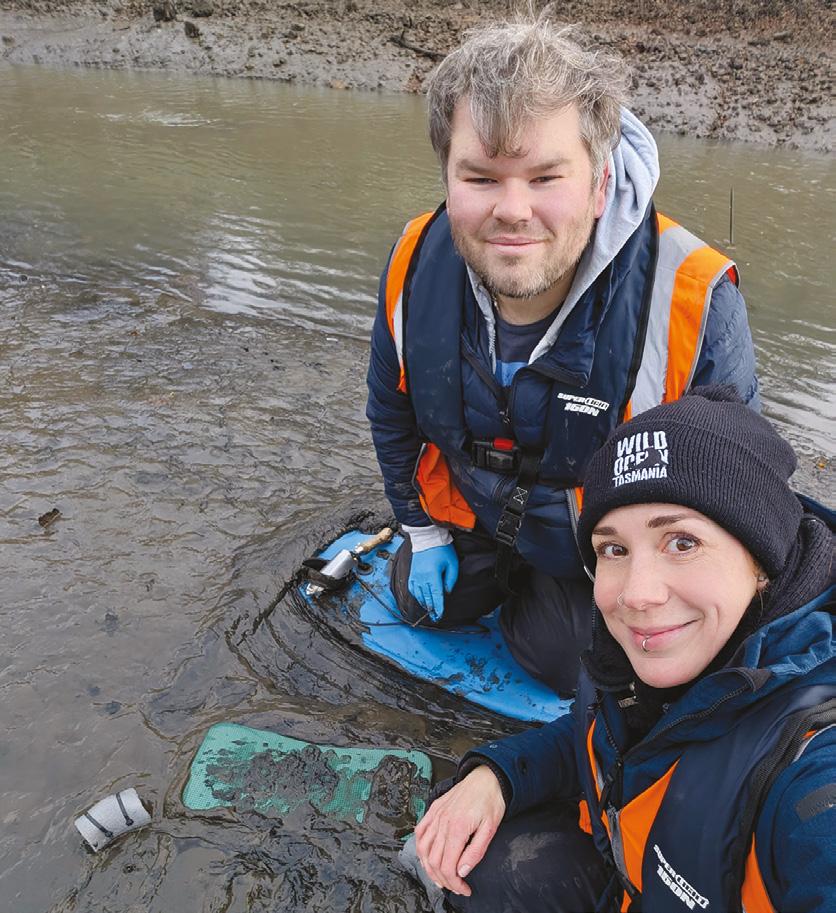 Blair Watson and Dr Martina Bristow planting seagrass in first trial at River Don.