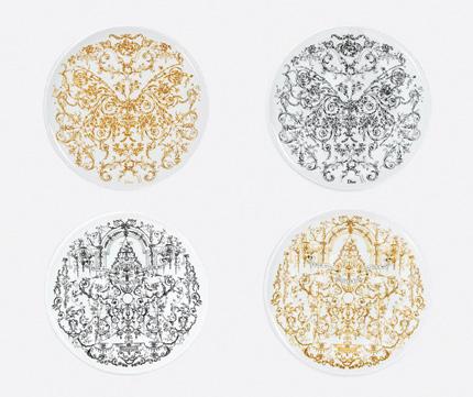 This set of four white-porcelain side plates features Dioresque star and butterfly motifs inspired by baroque theater from the Dior Cruise 2026 show. Each piece displays a dreamlike tableau enhanced with 24-carat gold or deep black detailing, creating poetic contrast. With delicate swirls and refined decoration, the plates elevate festive settings and harmonize beautifully with accompanying pieces from the collection.