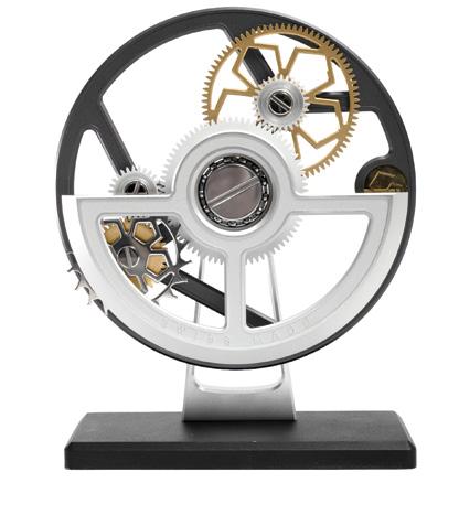 The Time Fast D8 Chrome Edition unites vintage F1 inspiration with horological engineering, forming a kinetic sculpture that doubles as an eight-day mechanical clock. Aluminum bodywork, spoked wheels and a glass-domed escapement highlight design precision, while time is set through the steering wheel and winding occurs by rolling the car in reverse. Crafted with intricate components, it embodies playful sophistication.