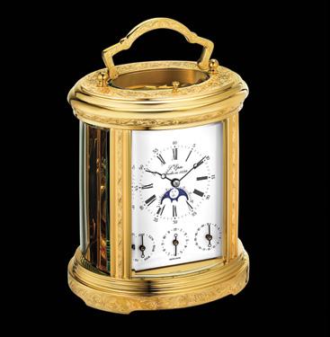 The Ovale Tourbillon Four Quarters Engraved is a unique, hand-engraved carriage clock featuring tourbillon, moon phase, alarm, calendar and quarter-hour striking mechanisms. Displaying hours and minutes on a white enamel dial, it houses an eight-day movement of remarkable complexity. Combining historical homage with 433 components, intricate relief work and refined mechanics, it exemplifies L’Epée 1839’s tradition of distinguished craftsmanship.