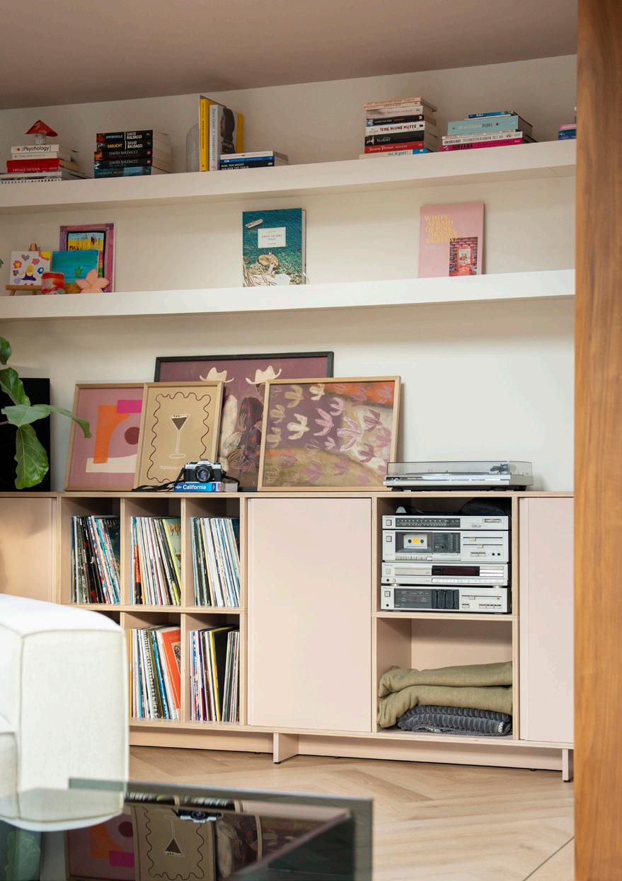 The pink ceiling was painted to match the colour code of the sideboard. Everything in between is a collection of vinyl records, books, and the kids’ crafts. There was just enough room on the sideboard for a few art prints that blend perfectly with my pink theme at home.