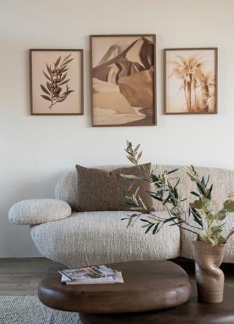 shapes of the furniture are a style rule we carry through into the selection of art. This allows the art to blend even more seamlessly into the space. Art featuring people, animals, and landscapes, as well as abstract art, fits this living style well.
