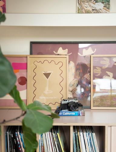 That collection of items creates a sense of organized chaos in one place. I like to balance that with simplicity in the form of large gestures that bring peace to my interior. This keeps the overall look cozy and personal without being too cluttered. The different art prints are essentially a small reflection of my home.” - Erica.
