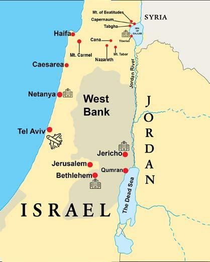 Tel Aviv • Netanya • Caesarea • Mt. Carmel • Tiberias • Cana • Nazareth • Capernaum • Sea of Galilee • Bethlehem • Jericho • Dead Sea • Jordan River • Jerusalem