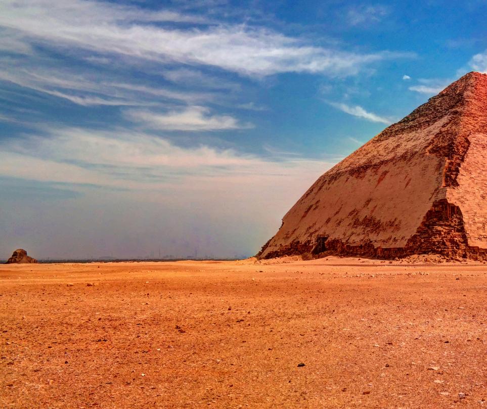 La Pirámide Roja (Pirámide Acodada), ubicada en la necrópolis de Dahshur, al sur de El Cairo, es la primera pirámide auténticamente lisa de Egipto y uno de los logros arquitectónicos más significativos del Imperio Antiguo. Construida por el faraón Senferu alrededor del 2600 a. C., la Pirámide Roja tiene 104 metros de altura, lo que la convierte en la tercera pirámide más grande de Egipto, después de la Gran Pirámide y la Pirámide de Kefrén en Giza. Llamada así por el tono rojizo de sus bloques de piedra caliza, la Pirámide Roja destaca no solo por su tamaño, sino también por su construcción casi perfecta, lo que marca un paso clave en la evolución de la construcción de pirámides. A diferencia de los intentos anteriores, los