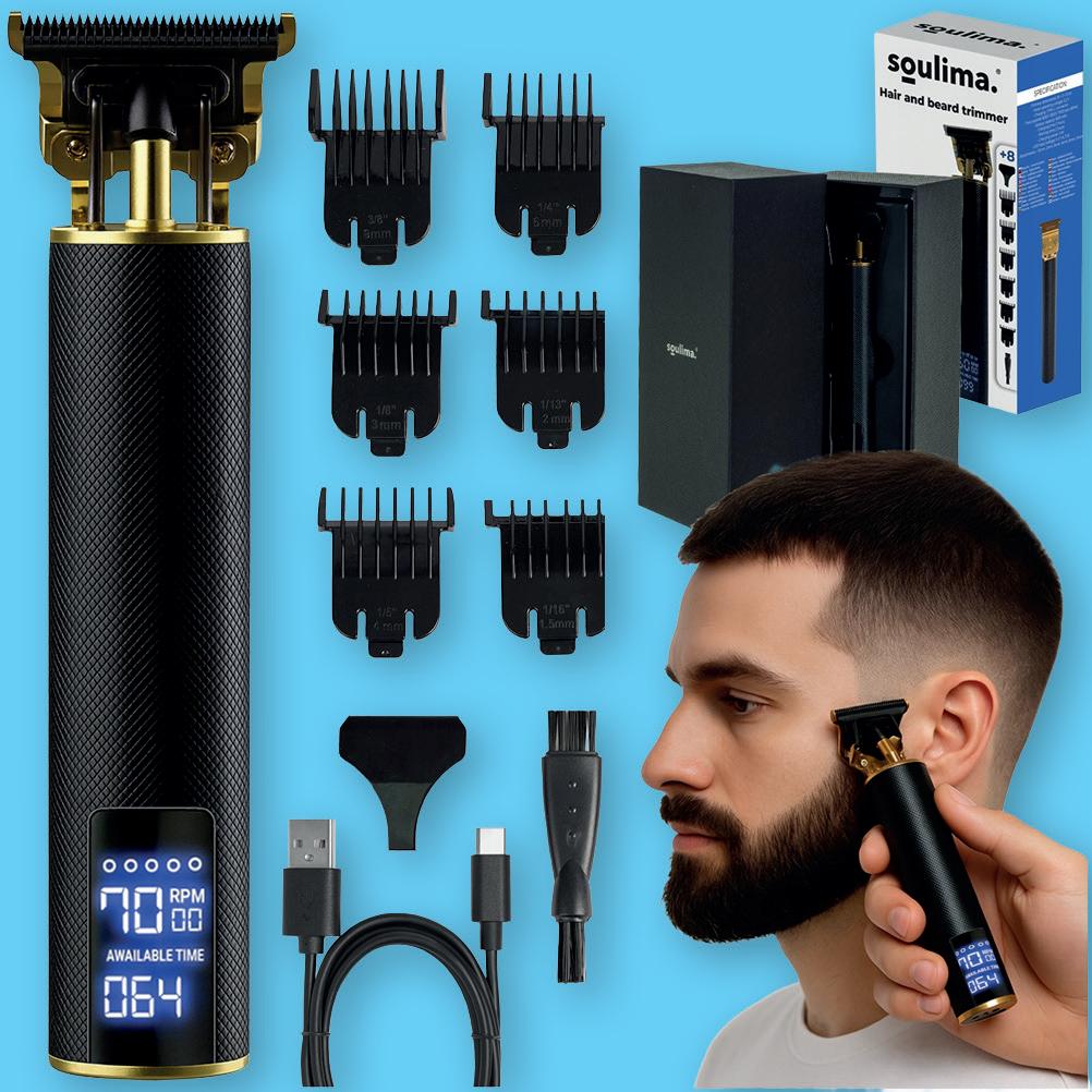 Maszynka w kolorze czarnym spełnia europejskie normy, jest bardzo wydajna, tnie włosy o dowolnej grubości i długości, sprawdza się do detali i wzorów, idealna do włosów, brody i wąsów, ma szybki, pojemny akumulator 600 mAh (90 min pracy, 120 min ładowania, moc 3 W, napięcie 3,2 V), trzy prędkości (6000/6500/7000 obr./min), wyświetlacz LCD, ergonomiczną antypoślizgową obudowę, wymiary 16×3,5×2,5 cm, oraz zestaw 6 nasadek.