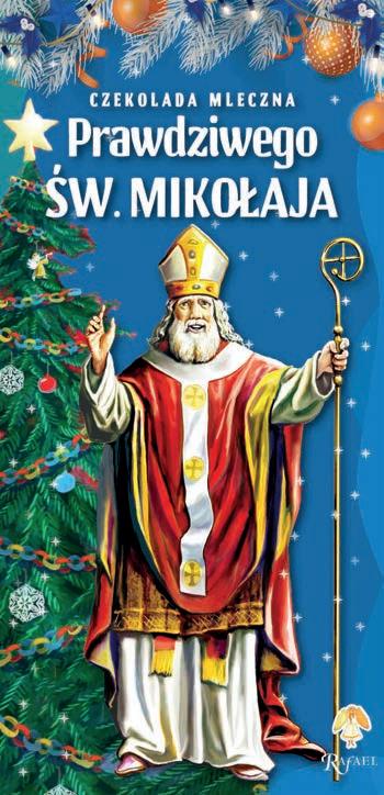 Czekolada mleczna w świątecznym opakowaniu przypomina dzieciom o prawdziwej postaci Świętego Mikołaja – biskupa, który pomagając ludziom głosił wielkość Pana Boga i wskazywał drogę ku świętości. Przypominamy, kim naprawdę był św. Mikołaj, prezentując jego wizerunek z wszystkimi biskupimi atrybutami. Wewnątrz oryginalnego opakowania kryje się tabliczka smacznej czekolady.