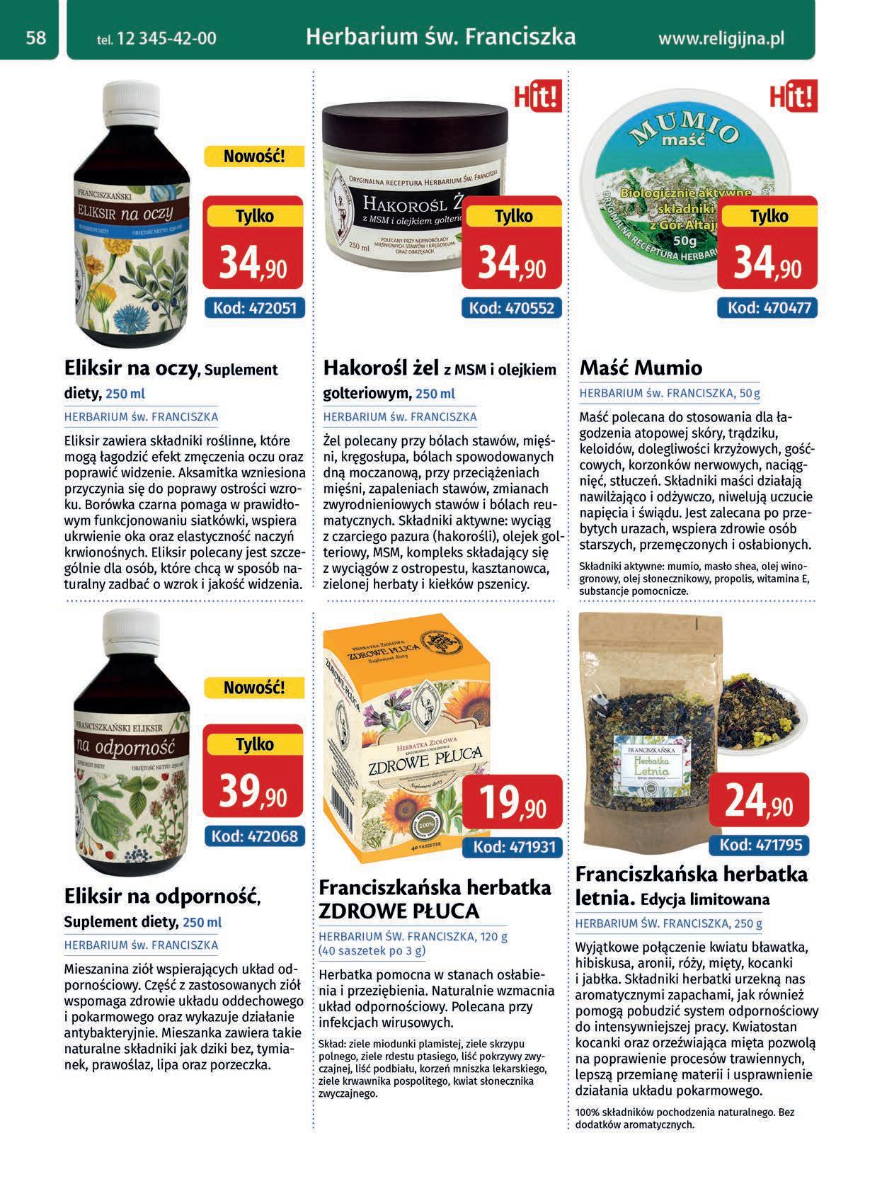 Szczególnie polecamy 3-5 Św. Jan Paweł II . . . . . . . . . . . . . . . . . . . . . . . . . . . . . . . . . . . . . . 6-7 Benedykt XVI 8-10 Drogowskazy życia duchowego . . . . . . . . . . . . . . . . . . . . . . 11-17 Wokół Biblii 18-19 Modlitwa . . . . . . . . . . . . . . . . . . . . . . . . . . . . . . . . . . . . . . . . . 20-21 Dewocjonalia. . . . . . . . . . . . . . . . . . . . . . . . . . . . . . . . . . . . . . 22-25 Objawienia i cuda. . . . . . . . . . . . . . . . . . . . . . . . . . . . . . . . . . 26-28 Tajemnice Maryi . . . . . . . . . . . . . . . . . . . . . . . . . . . . . . . . . . . . . . 29 Święci . . . . . . . . . . . . . . . . . . . . . . . . . . . . . . . . . . . . . . . . . . . . 30-32 Zagrożenia i wyzwania . . . . . . . . . . . . . . . . . . . . . . . . . . . . . 33-34 Na różne okazje 35-37 Sekrety historii. . . . . . . . . . . . . . . . . . . . . . . . . . . . . . . . . . . . 38-39 Literatura piękna . . . . . . . . . . . . . . . . . . . . . . . . . . . . . . . . . 40-41 Podróże dalekie i bliskie . . . . . . . . . . . . . . . . . . . . . . . . . . . . . . 42 Podróże, książka i film 43 Z balsamem kapucyńskim, Po zdrowie ze św. Ritą 44 Produkty ziołowe Aromat Zdrowia, Co za smak! . . . . . . 45-47 Prawdziwa pszczela apteka . . . . . . . . . . . . . . . . . . . . . . . . 48-50 Po zdrowie ze św. Hildegardą . . . . . . . . . . . . . . . . . . . . . . . . . . 51 Oferta oo. Bonifratrów. . . . . . . . . . . . . . . . . . . . . . . . . . . . . 52-55 Suplementy diety . . . . . . . . . . . . . . . . . . . . . . . . . . . . . . . . . . 56-57 Herbarium św. Franciszka . . . . . . . . . . . . . . . . . . . . . . . . . . 58-59 Zdrowie 60-62 Poradniki 63 Co za smak! . . . . . . . . . . . . . . . . . . . . . . . . . . . . . . . . . . . . . . . . . . 64