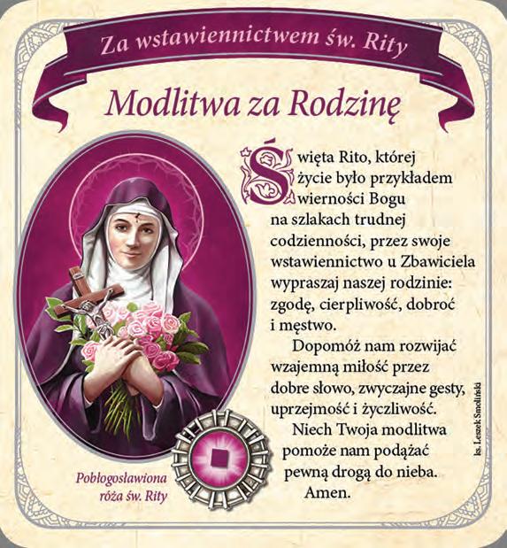 Piękny ścienny obrazek do każdego domu, w którym żywy jest kult św. Rity. Tym cenniejszy, że w porównaniu z tradycyjnymi obrazkami, obok wizerunku Świętej jest na nim także krótka modlitwa za rodzinę oraz medalik z płatkiem róży pobłogosławionej na nabożeństwie ku czci św. Rity.