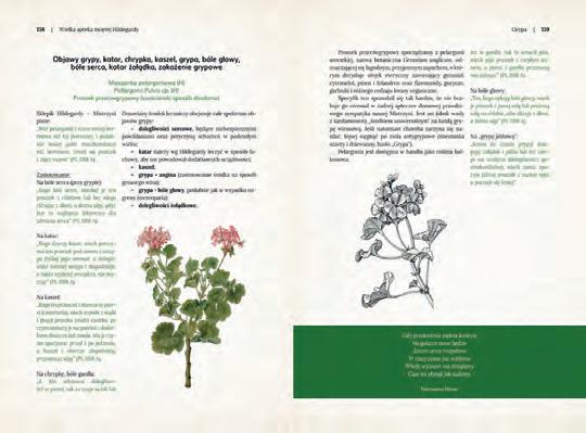 Monumentalny, efektownie ilustrowany zbiór cennych receptur na najczęściej dotykające nas choroby, stworzony w oparciu o dzieła medyczne świętej Hildegardy z Bingen, mniszki, wizjonerki, doktor Kościoła i jednej z najznamienitszych postaci w dziejach chrześcijaństwa. Wszystkie przedstawione tu receptury, zaczerpnięte z bogatego dorobku św. Hildegardy, zostały opracowane według reguł współczesnej medycyny przez wybitnych specjalistów, doktora nauk medycznych Gottfrieda Hertzkę i doktora biochemii Wigharda Strehlowa. W dziele zamieszczono ok. 500 naturalnych sposobów na rozmaite schorzenia i dolegliwości, m.in. żołądka i jelit, skóry, układu nerwowego, serca i układu krwionośnego, płuc, głowy oraz innych narządów ludzkiego ciała.
