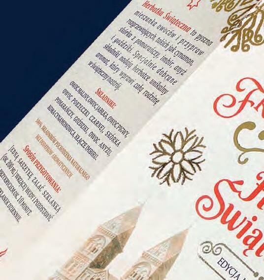 3Świąteczne smakitel. 12 345-42-00 www.religijna.pl Franciszkańska Herbatka Świąteczna w puszce HERBARIUM ŚW. FRANCISZKA , 20 saszetek po 5 g Herbatka świąteczna to pyszna mieszanka owoców i przypraw rozgrzewających, takich jak cynamon, skórka z pomarańczy, imbir, anyż i goździki. Specjalnie dobrane składniki nadają herbatce unikalny świąteczny aromat. Skład: owoce: maliny, jabłka, pigwy, czarnej porzeczki, skórka pomarańczy, goździki, owoc anyżu, kora cynamonowca, kłącze imbiru. Franciszkańska Herbatka Świąteczna w pudełku HERBARIUM ŚW. FRANCISZKA , 20 saszetek po 5 g 36,90 Kod: 471078 Kod: 471085 24,90 Czekolada mleczna Świętego Mikołaja AROMAT I