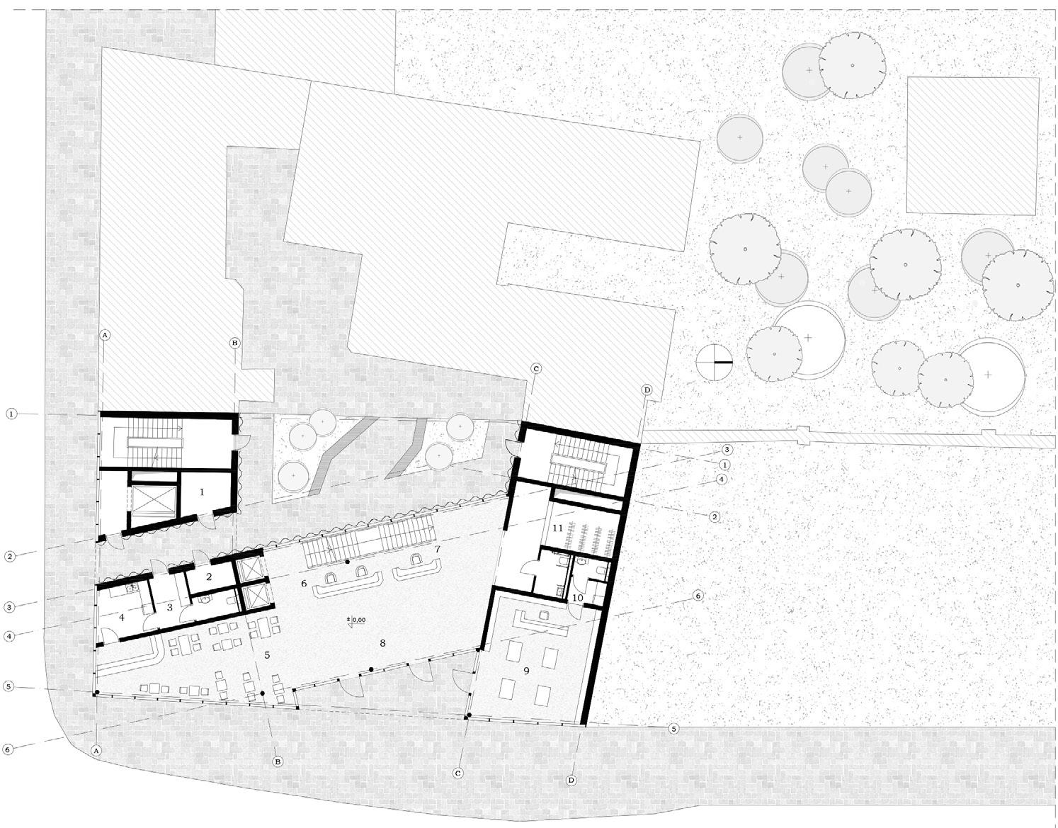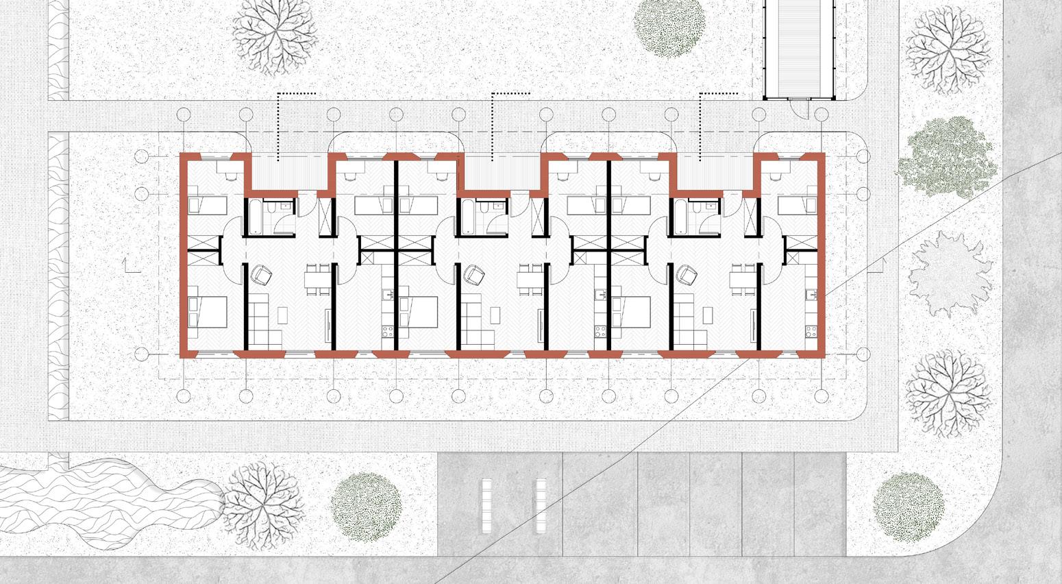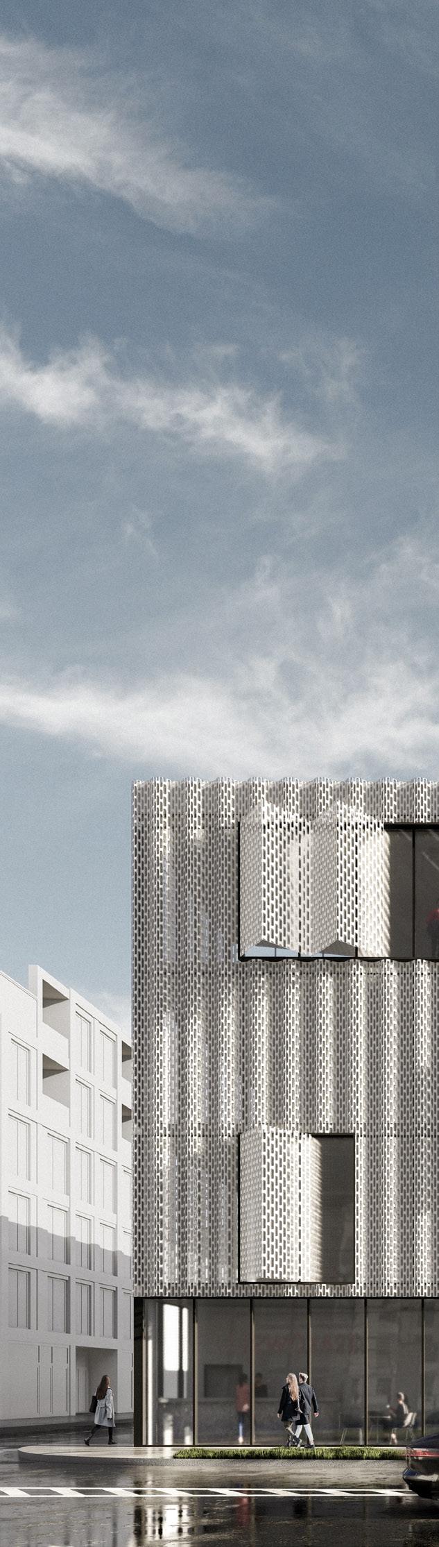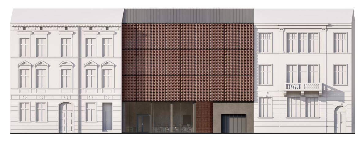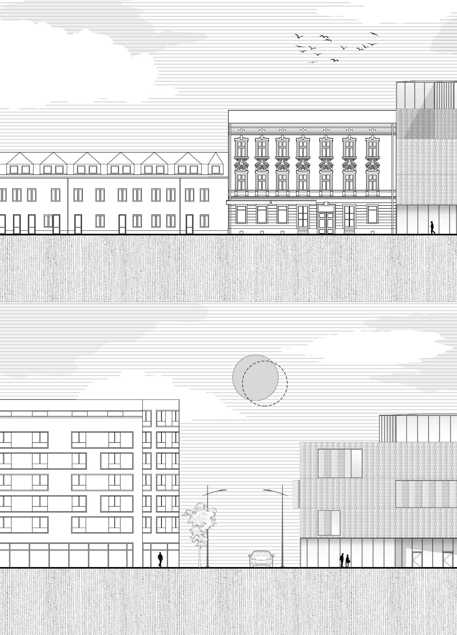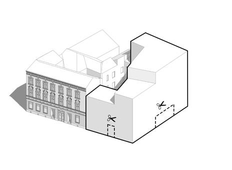 Etap 4: Zachowanie możliwości przejścia do sąsiedniego budynku oraz zaakcentowanie wejścia głównego poprzez wycięcie bryły na poziomie parteru.