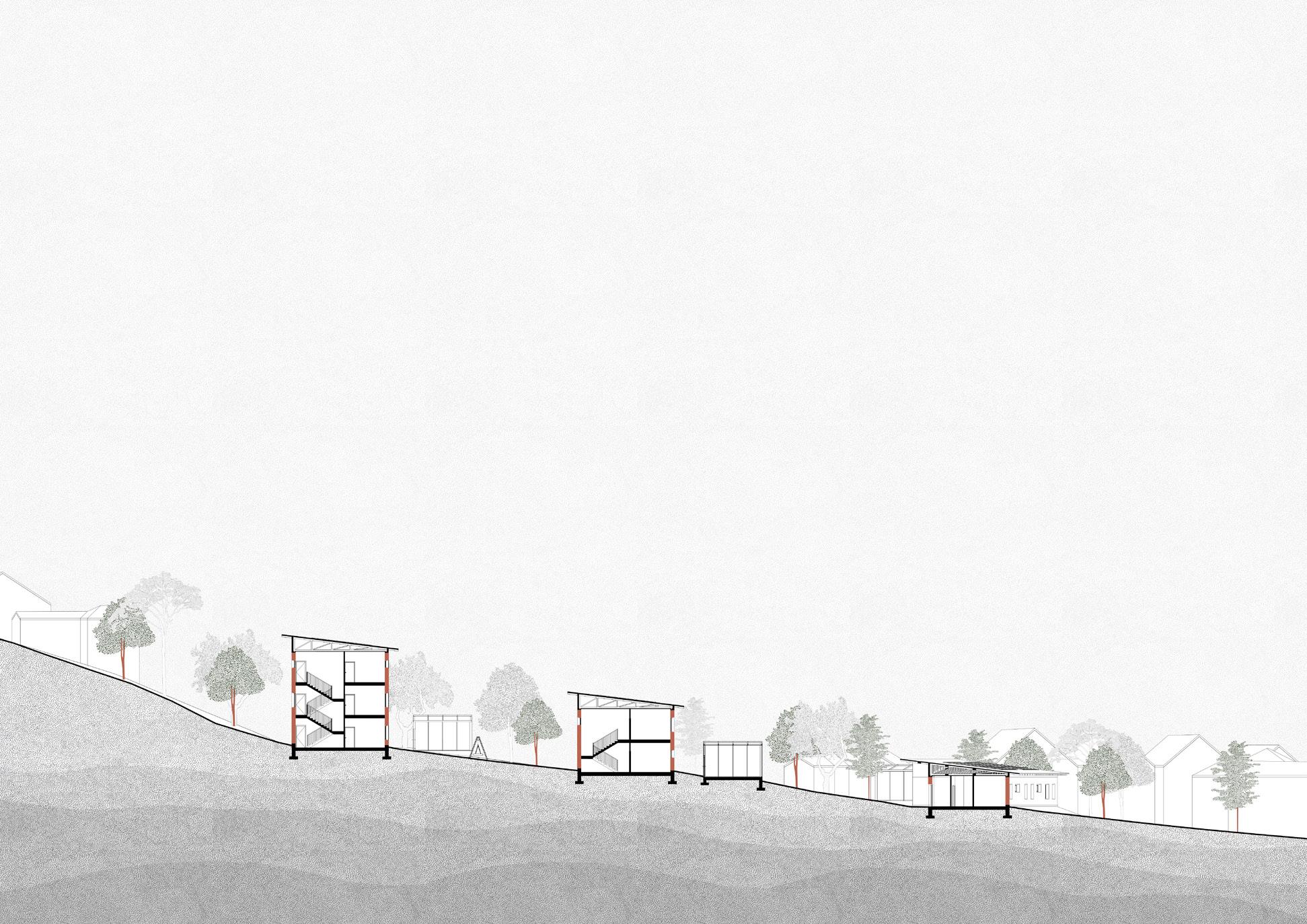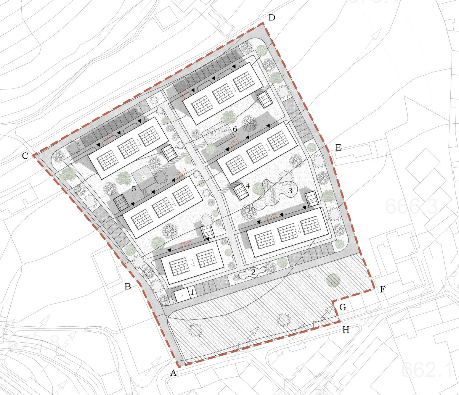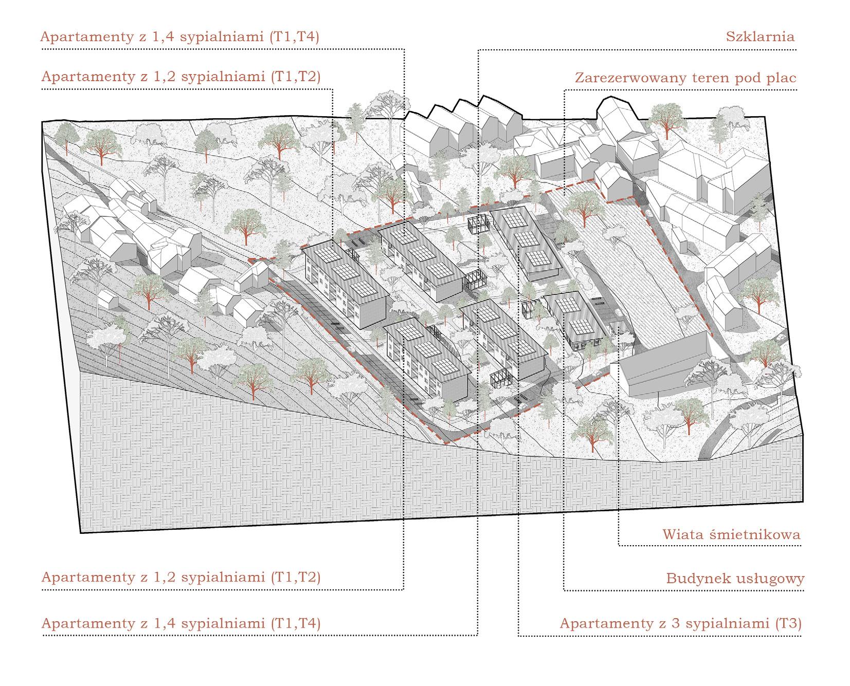 Etap 5: Stworzenie zielonych dachów na różnych poziomach dla zapewnienia powierzchni biologicznie czynnej działki.