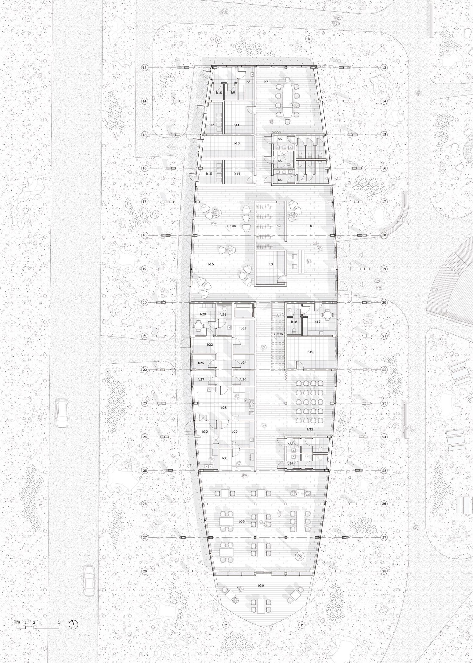 Aranżacja stref mediateki wynika z chęci stworzenia otwartej i jasnej przestrzeni z uwzględnieniem miejsc do pracy indywidualnej i grupowej. Na pierwszym piętrze znajduje się czytelnia z wolnym dostępem do zbiorów, czytelnia z księgozbiorem i wypożyczalnią dla dzieci oraz pokój prac grupowych. Czytelnia usytuowana również na kolejnym piętrze wraz ze strefą multimedialnych stanowisk komputerowych. W północno-wschodnim narożu znajduje się strefa administracyjna. Aby zachęcić użytkowników do poruszania się po mediatece, postanowiłam wzbogacić wnętrze o różnorodne warianty miejsc siedzących. Otóż obok głównej klatki schodowej, prowadzącej na trzecie piętro, zaprojektowałam wielopoziomowe siedziska, przypominające stadion. Wygodne schodki z poduszkami otoczone z jednej strony wbudowanymi półkami na książki, tworzą idealny kącik do czytania ulubionej książki, czy pracy przy laptopie.