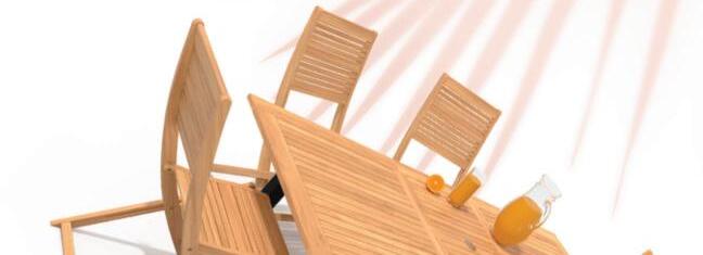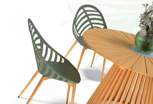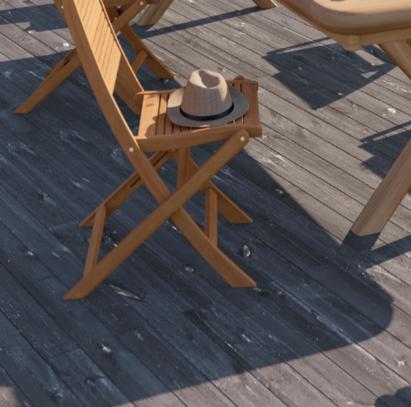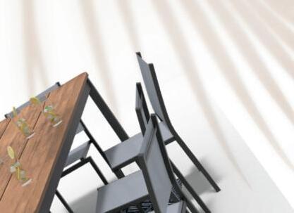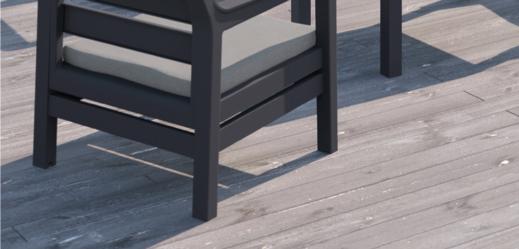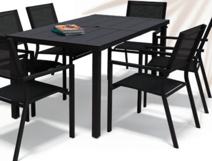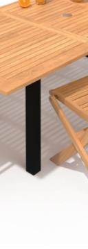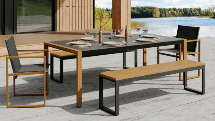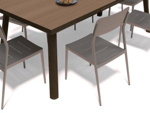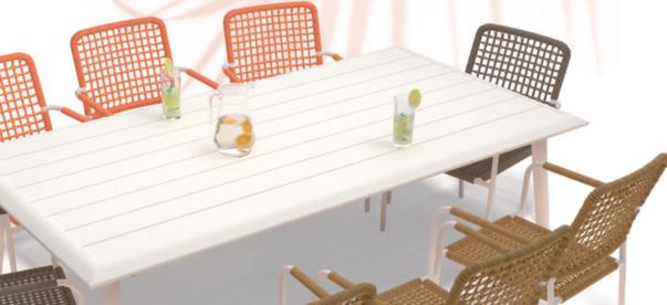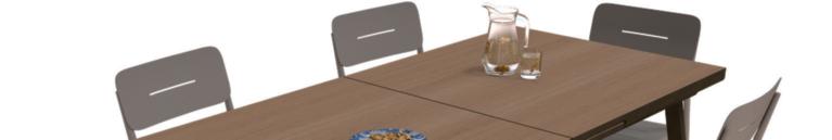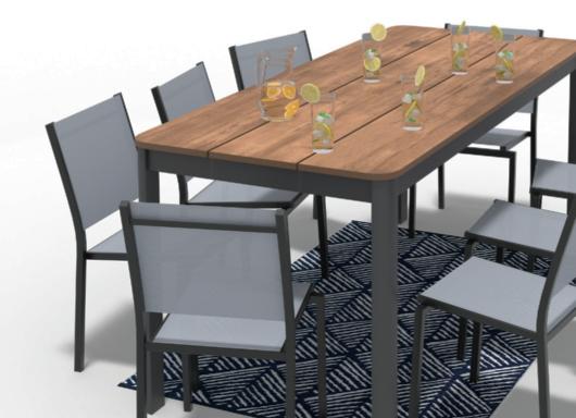 Structure en aluminium traitée anticorrosion. Plateau en résine effet et finition bois d'ép. 5 mm.