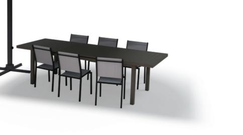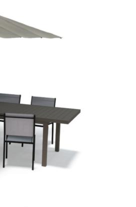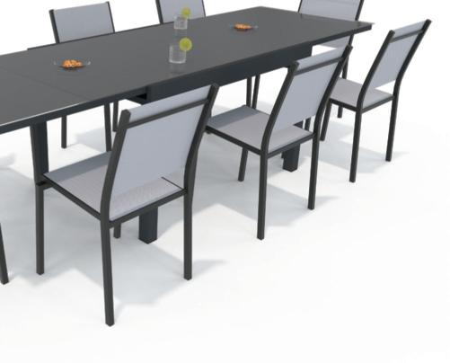 Structure et plateau en aluminium. Dim. : L. 135/270 x l. 90 x H.75 cm.