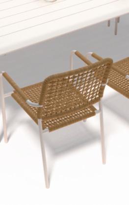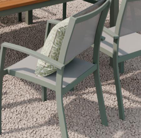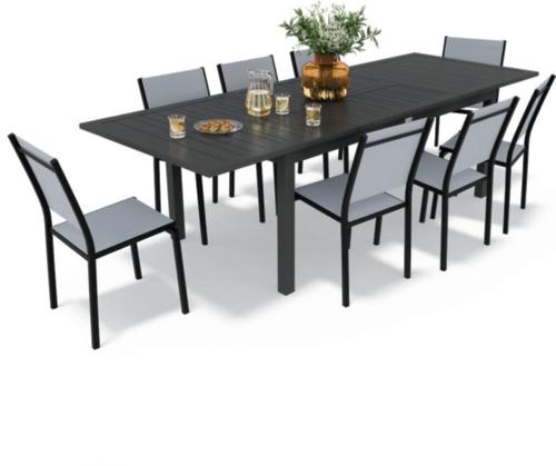 Table structure et lattes en aluminium traitée époxy pied en acier. Fauteuils en acier. Assises et dossiers recouverts de polyéthylène avec coussins en polyester de 275 gr/m². Comprend : - 1 table, dim. : L.215 x l.102 x H.74,5 cm env, - 8 fauteuils, dim. : L.51 x l.51,5 x H.68 cm.