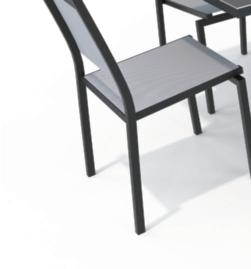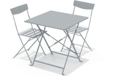 Comprend : - 1 Table basse : L. 70 x l. 70 x H. 42 cm, - 3 Chaises : L. 80 x l. 82 x H. 63 cm, - 1 Fauteuil gauche et 1 fauteuil droit : L. 82 x l. 82 x H. 63 cm. Coloris : gris.