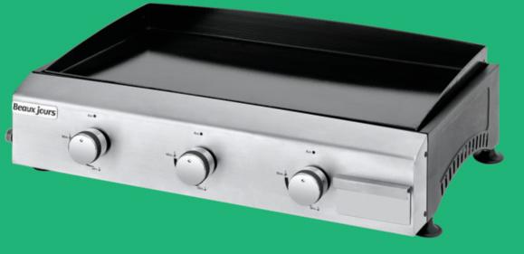 Dim. (hors tout)(2) : L. 67 x l. 47 x H. 20 cm env. Surface de cuisson : L. 61,5 x l. 35 cm. Puissance : 8,4 kW. Plaque de cuisson en fonte émaillée, brûleurs en acier inoxydable. Allumage automatique et facile. Récupérateur de graisses. Pieds réglables.