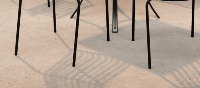 Piètement en acier et pourtour du plateau en aluminium. Plateau en verre trempé 5 mm imitation terrazzo.