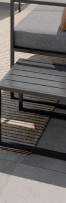 Structure en acier. Coussins déhoussables d'ép. 15 cm, 100% polyester - 220gr/m². - canapé : 3 places : L.192 x l.66 x H.69 cm, - canapé : 2 places : L.124 x l.66 x H.69 cm, - fauteuil : L. 66 x l. 66 x H. 69 cm, - petite table: L. 50 x l. 50 x H. 34 cm, - grande table L. 90 x l. 50 x H. 34 cm.