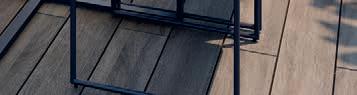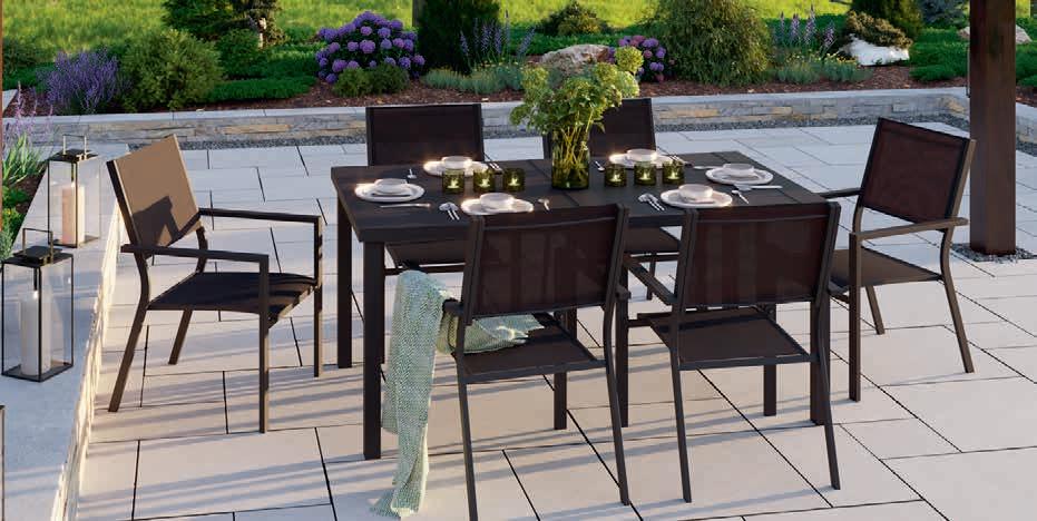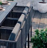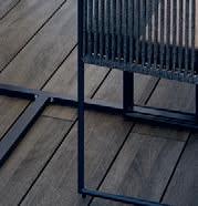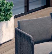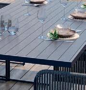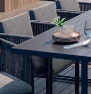 Structure en acier, plateau de table avec lattes en aluminium, cordes et coussins en polypropylène.