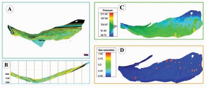 7 Model of the COSS. A) Static threedimensional representation of the COSS model for the Ontario study area. B) Representative crosssectional view of the static model, illustrating the stratigraphic framework. C) Spatial distribution of reservoir pressure corresponding to the second simulation scenario. D) Gas saturation distribution following CO2 injection, highlighting plume evolution within the storage formation.