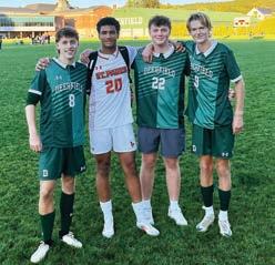 Jadin Smith ’23, Evers Saleeby, Cooper Johnson ’23 and Stefan Flaska on Deerfield’s soccer field during the 2024 game with St. Paul’s.