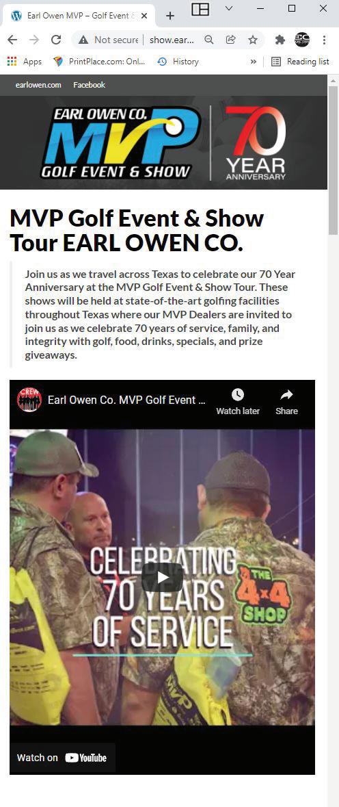 Traveling Show 1: Thursday, February 24, 2022 Traveling Show 2: Friday, February 25, 2022 Traveling Show 3: Thursday, March 31, 2022 Traveling Show 4: Friday, April 1, 2022 Top Golf San Antonio, TX Register for San Antonio SCAN ME Top Golf Register for Houston SCAN ME Register for Lubbock SCAN ME Register for The Colony SCAN ME • Online Trade Show will be held the week following each event. • Every attendee will be able to participate in the discounts. EARL OWEN CO. MVP GOLF EVENT & SHOW TOUR JOIN US AS WE CELEBRATE OUR 70 YEAR ANNIVERSARY