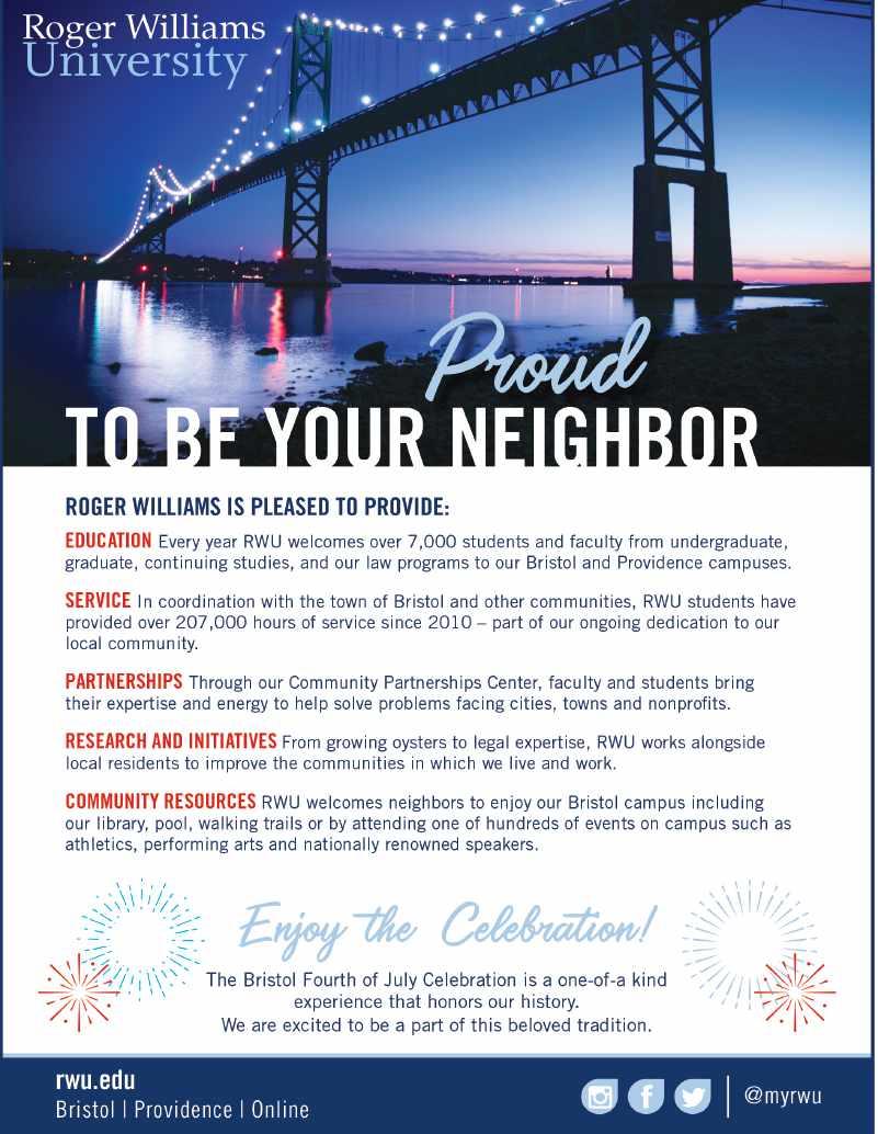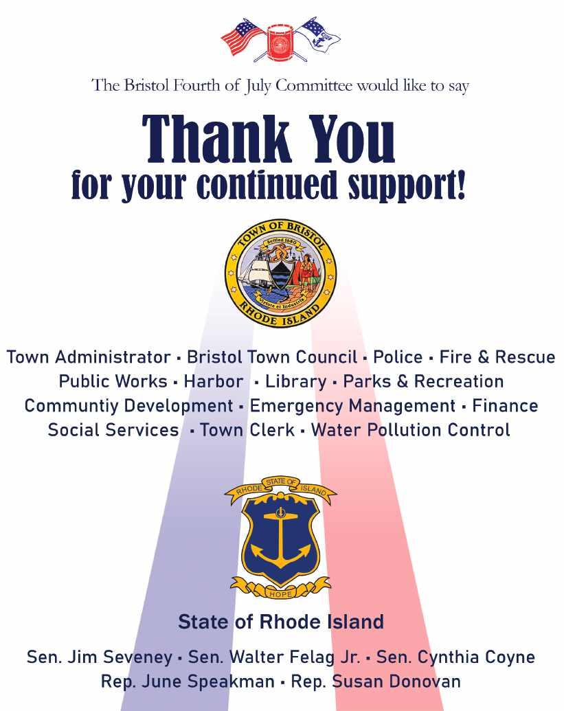 Welcome to Bristol, Rhode Island, where we have been celebrating our nation’s independence longer than anywhere. Our 237th celebration on July 4 is the culmination of many people’s hard work. From our all-volunteer committee, to our Town Officials, our Town departments, our Police and Fire departments, they all are the real heroes of our celebration.