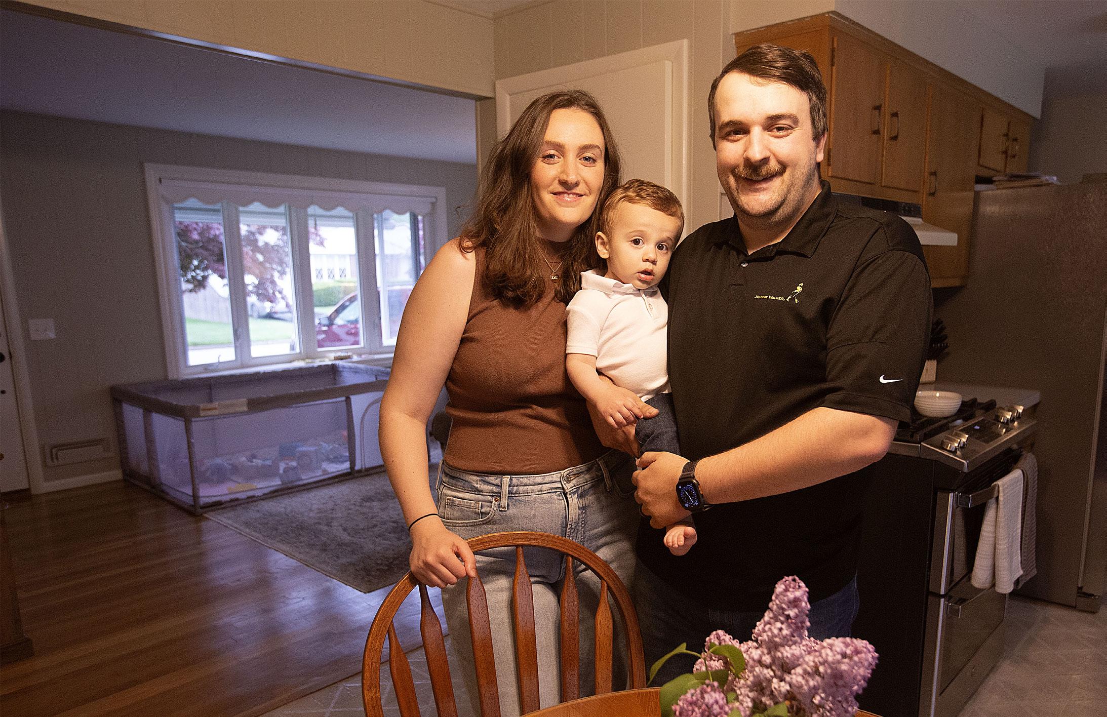 Despite the challenges of a seller’s market, first-time homebuyers Maddie Coccio (left), her 11-month-old son, and husband Ryan moved into their first home on April 10, 2025, after finding a property within their $400,000 to $450,000 budget that offered a backyard, a laundry room, and ample space for their growing family.