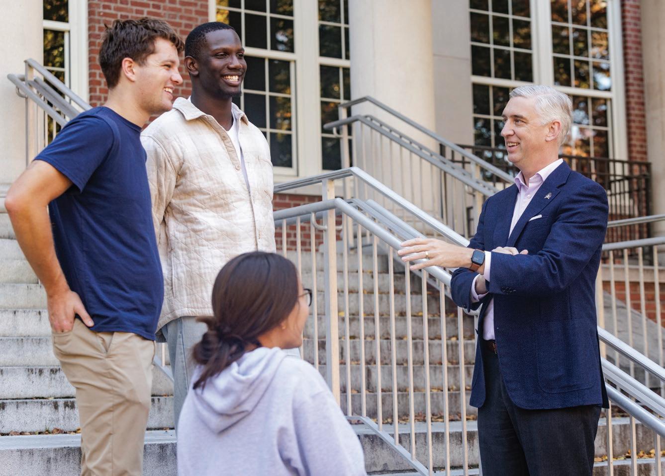 Chancellor Philip Rogers talks with first-year students Dylan Livingston-Keeter, Michael Raye and Caroline Zick. The students are part of the inaugural group of 75 Chancellor’s Scholars enrolled at ECU. Read more about how scholarships programs aim to attract and retain undergraduate students on page 34. (Photo by Steven Mantilla)