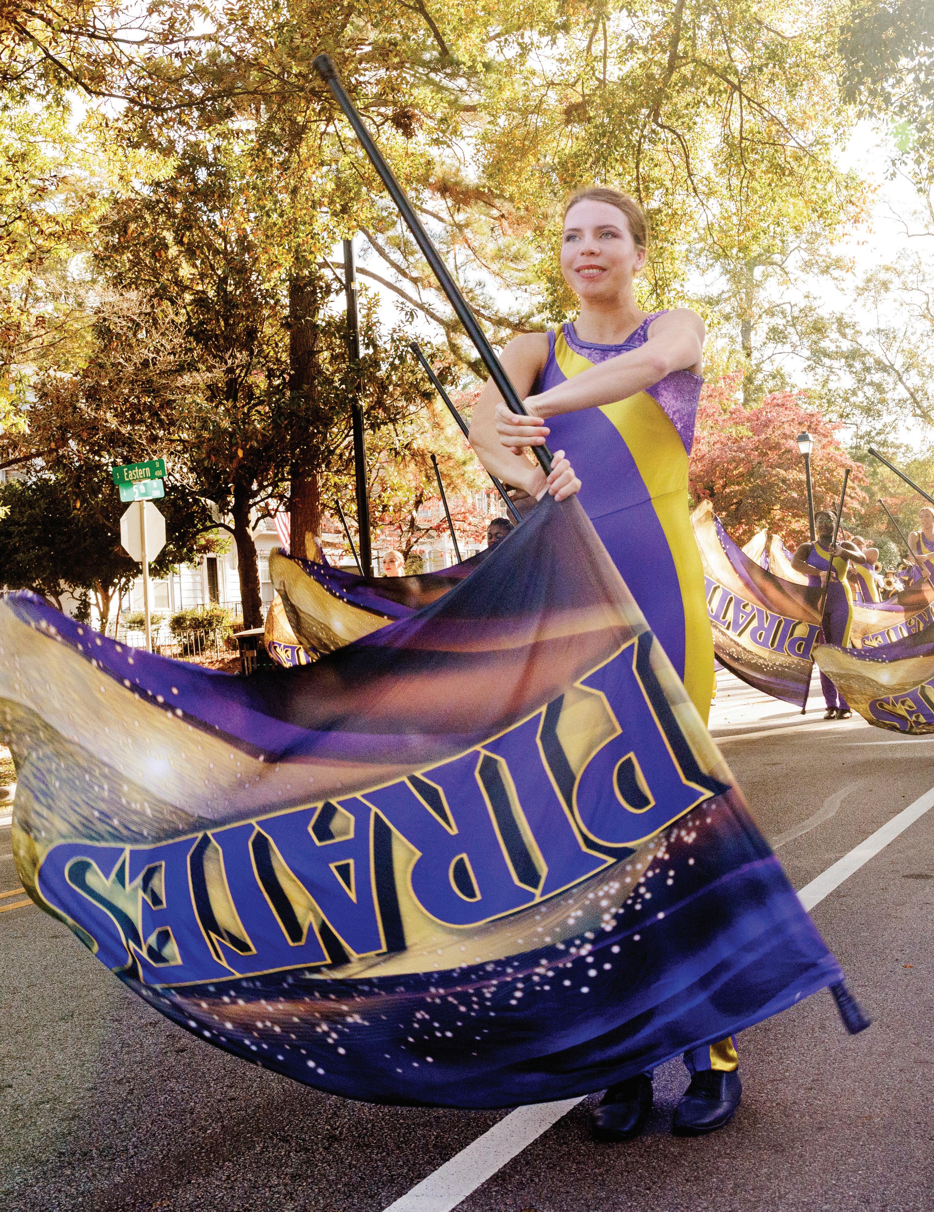 Sewickley, Pennsylvania’s Sydney Hanna, a color guard section leader for the Marching Pirates, participates in the homecoming parade Nov. 8 in Greenville. Later that day, the football Pirates defeated the UNC Charlotte 49ers 48-22 in front of 39,096 fans. (Photo by Steven Mantilla)