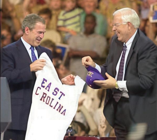 Approximately 9,000 people crowded into Minges Coliseum on April 12, 2001, to hear President George W. Bush, the first sitting president to visit campus. During his speech, he promoted his plans to increase spending on education and push through a trillion-dollar tax cut. In addition to the crowd in Minges, thousands more listened as the event was broadcast over speakers in DowdyFicklen Stadium. While at ECU, Bush also reported China had released 24 crew members of a U.S. Navy spy plane who had been held captive for 11 days.