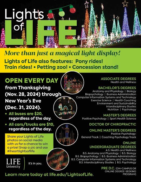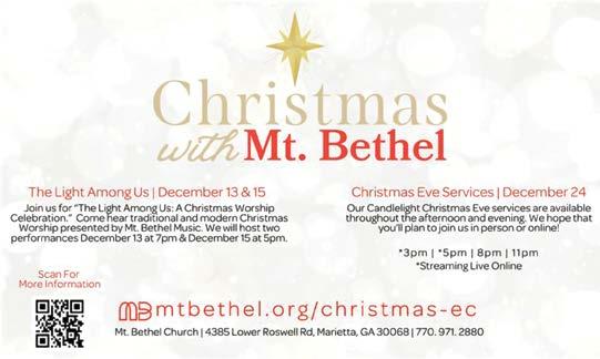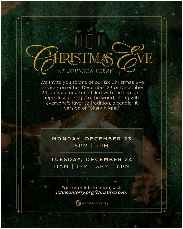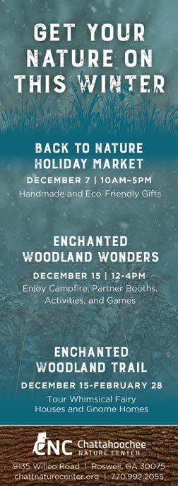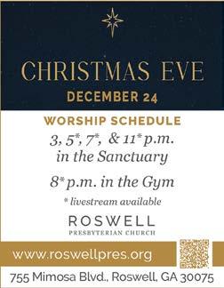 Roswell Christmas Tree Lighting. This event will include choral performances, hot chocolate, fire pits and s’mores, a special reading of ‘Twas the Night Before Christmas by Mayor Kurt Wilson, a visit from Santa Claus, and the culminating event: the lighting of a 40-foot Christmas tree at the center of Heart of Roswell Park. Canton Street, between Norcross Street and Magnolia Street, will be closed (similar to Alive in Roswell). 6-pm. Free. Heart of Roswell Park 925 Canton Street, Roswell www.roswell365.com/event/ roswells-annual-lighting-of-the-christmas-tree-2024