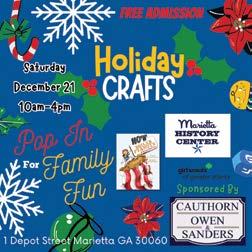 Pop-In for Family Fun at the Marietta History Center. Crafts and activities will be provided to create a fun learning environment that explores different topics of history with a local focus. This month’s theme is Holiday Crafts. Free. 10am-4pm. Marietta History, Center, 1 Depot Street, Marietta. More info: 770-794-5710 or mariettahistory.org.