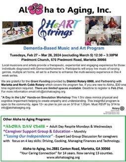 For more information and to schedule an appointment, visit aarp.org/taxaide. The “Catch’em Fishing Club” is looking for new members to share stories and friendship. Meetings start at 10am on the first Monday of each month, except holidays, at the East Cobb Senior Center, 3332 Sandy Plains Road, Marietta/East Cobb. There is no cost. For more information, contact Hank Klarzuk, 770-971-5240.