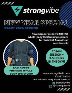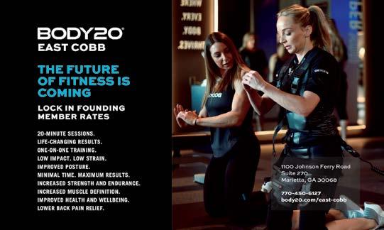 Body20 is technology training for all fitness levels. Burn calories, reduce cellulite, tone up, and build lean muscle with BODY20, a boutique fitness studio that utilizes an FDA-Cleared electro-muscle stimulation suit. In just a 20-minute training session, your trainer will put you through a customized 1-on-1 program, giving your body over 150 times more muscle contractions than a conventional workout without any need to pick up a weight or use traditional gym equipment. You can read more about Body20 on pages 6&7. The studio is at 1100 Johnson Ferry Road, Unit 270, in Marietta/ East Cobb. For more information, stop by the Grand Opening on January 11, between 5-8 pm, check out the website www.body20.com, or call to set up your free demo at 770-450-6127.