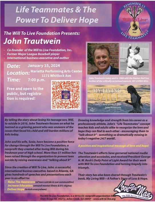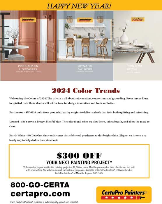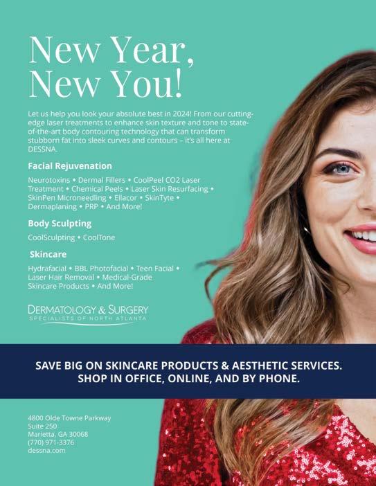 Welcome, 2024! It’s officially the start of a New Year, and for most of us, it means the start of a New Year’s resolution list! This time of year sees many of us setting worthy goals for ourselves: eat less, exercise more, read more… self-improvement is always important. The Health & Wellness section, (pages 22-33) offers local resources and experts to help you achieve some of those New Year resolutions. One of the best parts about ringing in the New Year is the chance to reflect on our own lives over the past year and make goals to help us do things a little better. If living a long life is on your “to-do” list read about East Cobb’s own 106-year-old Ms. Lillian Skarsten Mortimer on page 8, maybe you can figure out her secret.