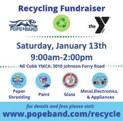 Please join the Pope High School Band at our upcoming Community Recycling Event on Saturday, January 13th from 9am-2pm at the NE Cobb Family YMCA located at 3010 Johnson Ferry Road, Marietta, 30062. We accept metal, electronics, appliance, glass, paper shredding while you watch, and we have REDUCED PRICES ON PAINT RECYCLING this year!! For more information, visit: www.popeband.com/recycle. We also offer residential and business pick up, email us at popebandrecycling@gmail.com to get started.