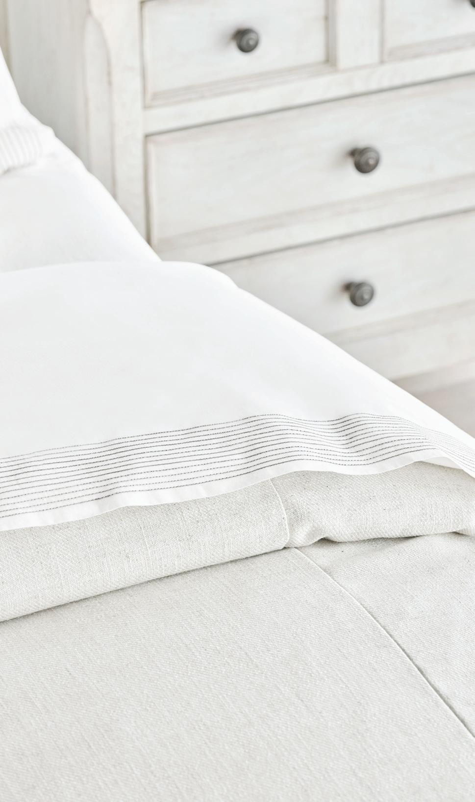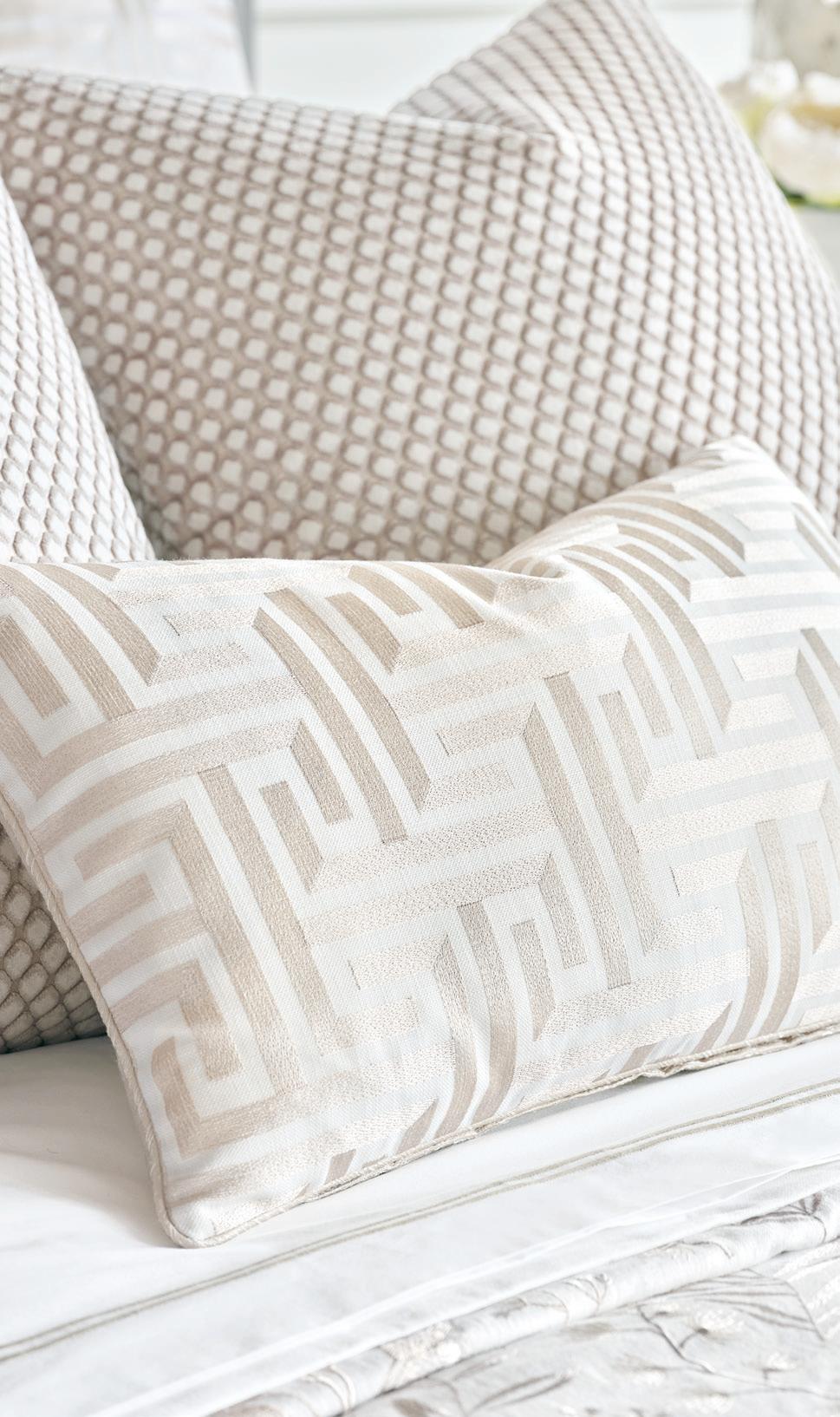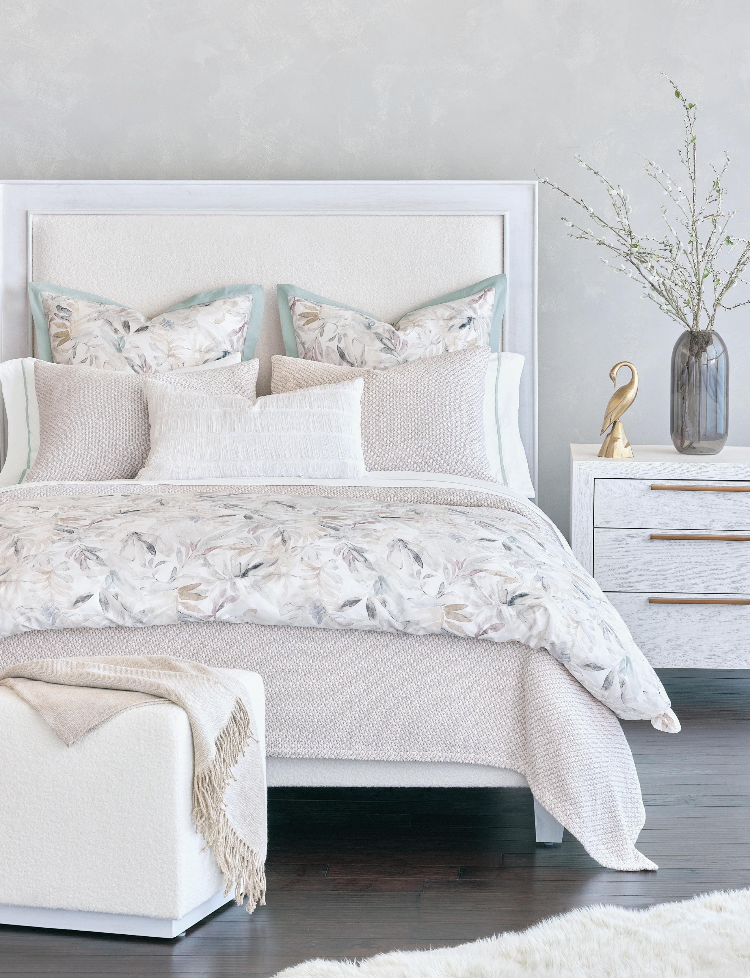 Light, brightness, and texture also take centerstage this year. Endlessly elegant Sussex is Barclay Butera’s homage to women’s formalwear. Shimmering embroidery and glittering beads dazzle against a backdrop of champagne and ivory. De’ Medici’s Meadow takes inspiration from New England’s atmospheric coastlines, interpreting a botanical print in dusty mauves and teals on silky sateen. One of our most exciting additions of the season isn’t a bedding collection at all, but our jaw-dropping Dolce throws. Sourced from a leading Italian design house, each piece features stunning abstract patterns in versatile neutrals, crafted from cashmeres and virgin wools.