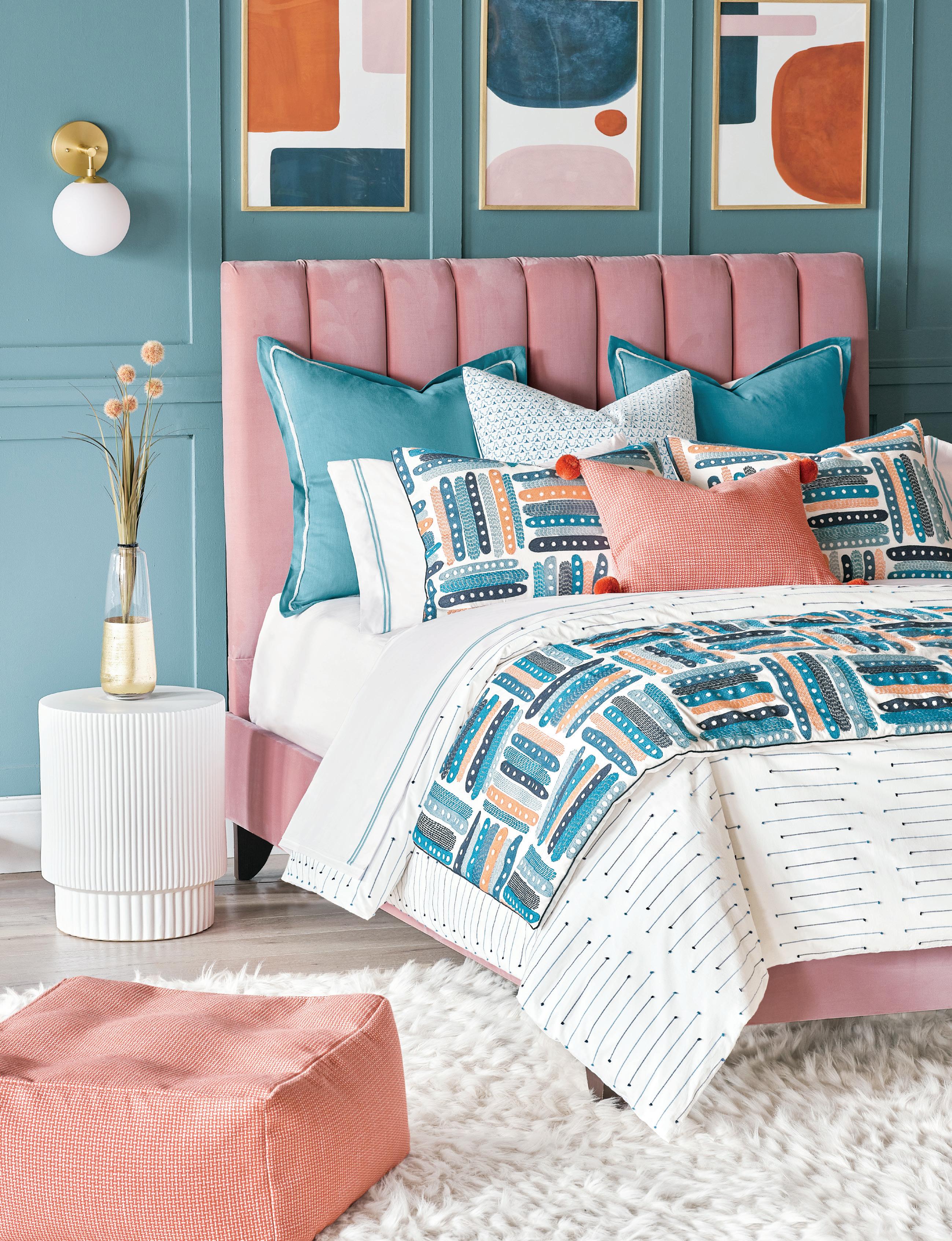 Have some fun with the stylized geometrics and saturated pastels of Phineas. Whether completing a colorful contemporary aesthetic or taking centerstage in a stylish kid’s room, this playful collection offers a spirited take on modern design. A fil-coupe duvet cover, bold graphic bed scarf, and versatile pink pouf give Phineas its undeniable charm.