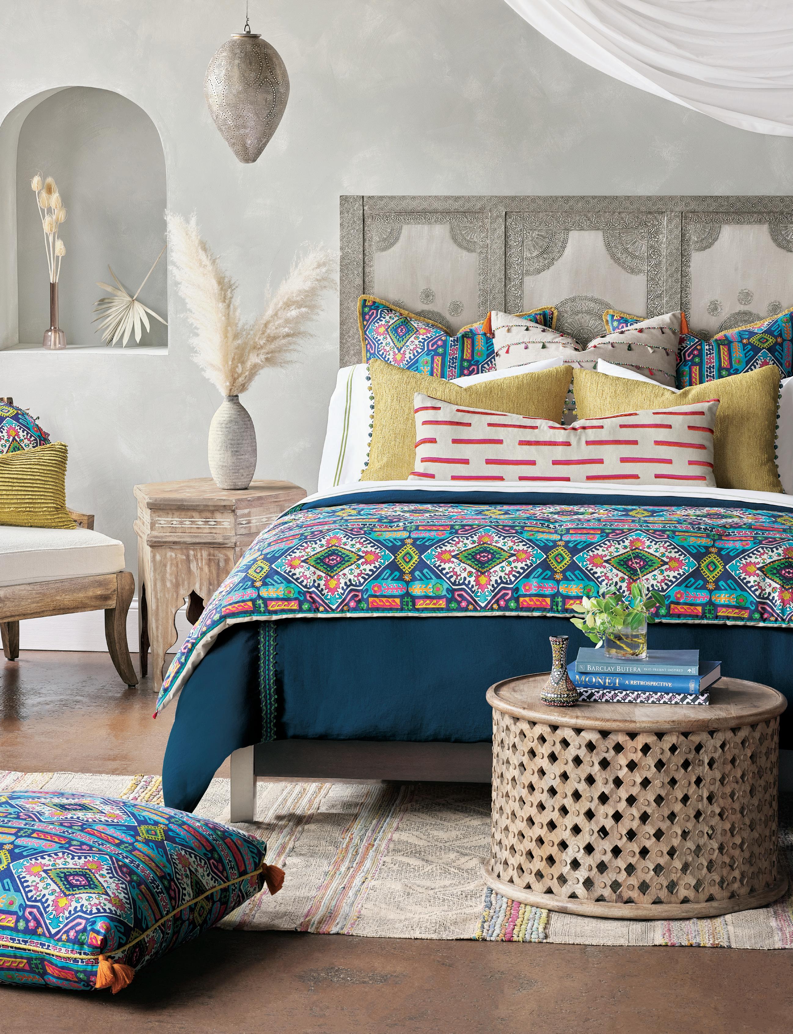 Drawing from the kaleidoscopic sights and sounds of a bustling bazaar, Fairuza luxuriates in layers of detailed pattern and texture. This worldly bedding collection blends the folkloric patterns of traditional Oriental rugs with colorful mini-tassels, washable 100% linen, and fun cut-embroidery. Complete with a color-blocked ottoman and tasseled curtain panels, Fairuza truly dances to the beat of its own drum.
