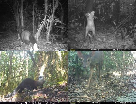 Foto 1. Algunas especies de mamíferos de mediano y gran tamaño registrados por las cámaras-trampa en la Reserva San Pablo. Arriba – izquierda: individuo de mayuato, Procyon cancrivorus; derecha: individuo de zorro de monte, Cerdocyon thous. Abajo – izquierda: individuo de hurón mayor, Eira barbara; derecha: individuo de corzuela parda, Mazama gouazoubira.